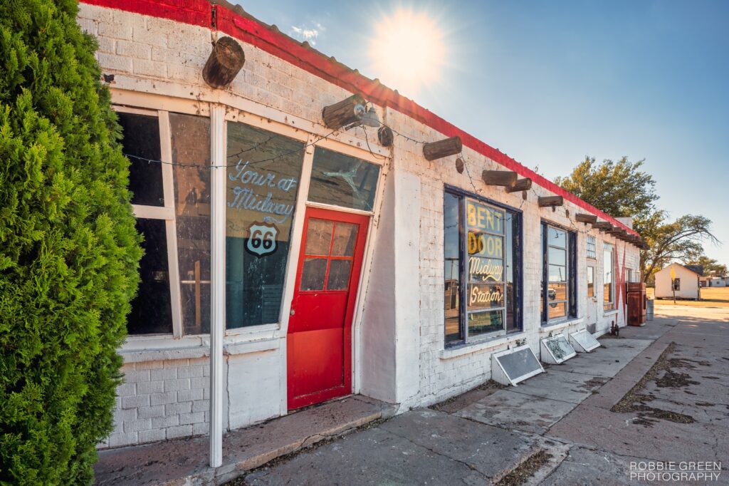 Adrian, Texas is the official midpoint of Route 66. The midpoint has slightly changed over the years with new motorways being developed, but history still remembers it as the midpoint. A white line on the road marks the distance to Chicago and Los Angeles—1,139 miles either way.