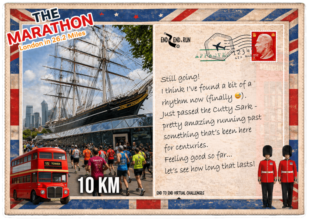 At around 10km, you pass one of London’s most iconic sights, the Cutty Sark.