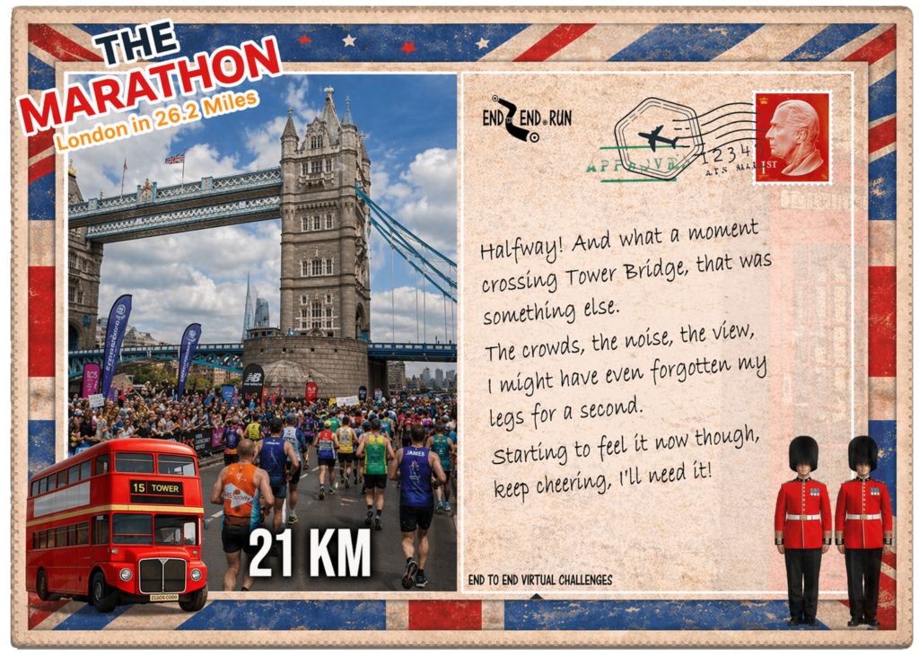 The route across Tower Bridge is famous for its energy, with crowds creating one of the loudest and most motivating sections of the entire course.